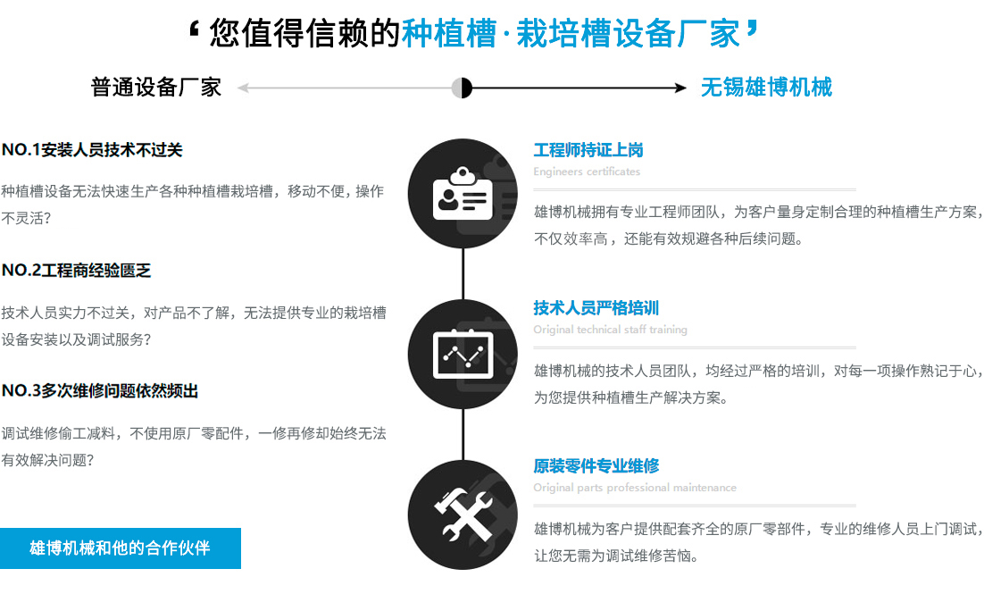 您在選擇雄博產(chǎn)品的同時,也選擇無微不至的終身服務(wù)。可根據(jù)不同客戶實際需求進行種植槽設(shè)備,栽培槽設(shè)備等的特殊工藝設(shè)計制造專業(yè)一對一售前/售后/技術(shù)咨詢指導,享受更貼心/放心的設(shè)備使用體驗。